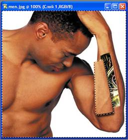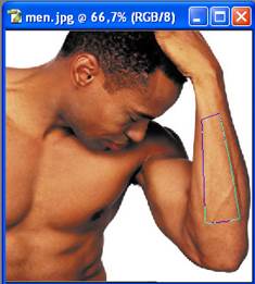 Шаг 1. Откройте фотографию человека, которого вы решили превратить в киборга (например, men.jpg). В данном случае мы будем работать с фотографией спортсмена. Шаг 2. Нажмите клавишу < P>, чтобы выбрать инструмент Перо (Pen), с помощью которого нарисуйте контур. Щелкните один раз (прямо под кистью у левой части руки), переместите инструмент вправо, щелкните и перетащите инструмент немного вверх (чтобы получить искривленную линию). Переместите инструмент вниз, щелкните и перетащите его немного “наружу”, чтобы получить искривленную линию. Щелкните в нижней левой точке. Шаг 3. Щелкните на исходной точке, чтобы замкнуть контур, как показано на рисунке. Если инструмент Перо вам не нравится, можно воспользоваться инструментом Полигональное Лассо, однако в данном случае можно будет создать только прямые линии, которые не будут полностью соответствовать контурам руки. Поэтому вам придется идти на компромисс между простотой и достоверным внешним видом. Шаг 4. Нажмите комбинацию клавиш < Ctrl+Enter>, чтобы преобразовать контур в выделенную область.