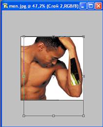 Шаг 6. В палитре Слои щелкните на фоновом слое, чтобы активизировать его. Нажмите клавишу < W>, чтобы выбрать инструмент Волшебная палочка (Magic Wand). Щелкните на белой области, которую необходимо вырезать. Область окажется выделенной. Шаг 7. Откройте фотографию, фрагмент которой планируете использовать в качестве “электронной начинки” (например, electro.jpg). Вместо нее можно использовать и другие фотографии, на которых присутствуют сплетения деталей и проводов. Нажмите комбинацию клавиш < Ctrl+A>, чтобы выделить фотографию. Нажмите комбинацию клавиш < Ctrl+C>, чтобы скопировать фотографию в буфер обмена. Шаг 8. Вернитесь к фотографии человека. Выделенная область должна оставаться активной. Выберите команду Вставить в (Paste Into) из меню Редактирование (Edit). В результате фрагмент фотографии будет вставлен из памяти в выделенную область. Скорее всего, вставленный фрагмент будет слишком большим, поэтому при выполнении следующего шага необходимо изменить его масштаб. Шаг 9. Нажмите комбинацию клавиш < Ctrl+T>, чтобы отобразить ограничивающую рамку Произвольная трансформация. Если вы не увидели все маркеры ограничивающей рамки, нажмите комбинацию клавиш < Ctrl+0>. В результате Photoshop уменьшит масштаб изображения, а вы увидите все необходимые маркеры, которые показаны на рисунке. Удерживая нажатой клавишу < Shift>, щелкните на одном из угловых маркеров и перетащите его “внутрь”, чтобы уменьшить масштаб “электронной начинки”, как показано на рисунке. Затем разместите “начинку” наиболее подходящим образом.