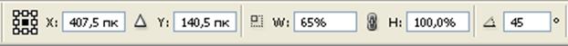 Теперь последний штрих: немного деформируйте блик в верхней части шара. Перейдите на Слой 4, трансформируйте (Ctrl+T) с параметрами 65% горизонтального масштаба и 45 градусов поворота, дважды нажмите Enter: