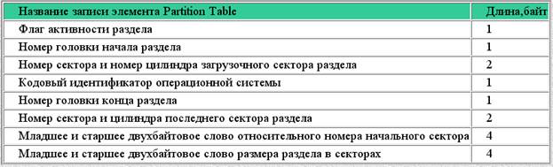 Каждый элемент таблицы разделов содержит информацию о логическом разделе. Первым байтом в элементе раздела идет флаг активности раздела (0 - не активен, 128 (80H) - активен). Он служит для определения, является ли раздел системным загрузочным и необходимости производить загрузку операционной системы с него при старте компьютера. Активным может быть только один раздел. Небольшие программы, называемые менеджерами загрузки (Boot Manager), могут располагаться в первых секторах диска. Они интерактивно запрашивают пользователя с какого раздела производить загрузку и соответственно корректируют флаги активности разделов. За флагом активности раздела следует байт номера головки с которой начинается раздел. За ним следует два байта, означающие соответственно номер сектора и номер цилиндра загрузочного сектора, где располагается первый сектор загрузчика операционной системы. Загрузчик операционной системы представляет собой маленькую программу, осуществляющую считывание в память начального кода операционной системы во время ее старта. Затем следует байт – кодовый идентификатор операционной системы, расположенной в разделе. За байтом кода операционной системы расположен байт номера головки конца раздела, за которым идут два байта – номер сектора и номер цилиндра последнего сектора распределенного разделу. Ниже представлен формат элемента таблицы разделов.