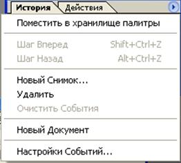 В линейном режиме, когда следующее событие зависит от предыдущего, если выделено, а затем удалено одно из предыдущих событий или возоблено редактирование изображения с более раннего события, все последующие события (на палитре их элементы станут тусклыми) также будут удалены. В нелинейном режиме можно выделить или удалить ранее происшедшее событие и при этом не потерять последующие. Эта опция включается / выключается с помощью команды Настройки Событий (History Options) à Разрешить Нелинейную историю (Allow Non-Linear History), которую можно выбрать в меню палитры История.
