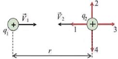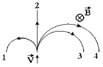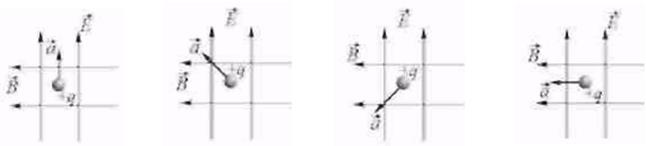 +1 2 3 4 ------------------------------------------------------------------------------------------------------------- 61. Положительно заряженная частица, летящая с постоянной скоростью по направлению от нас, влетает в скрещенные под прямым углом постоянные однородные электрическое и магнитное поля перпендикулярно им обоим. Правильное направление ускорения частицы в момент попадания в поля представлено на рисунке…