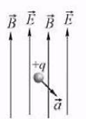 1) параболу 2) спираль +3) прямую линию 4) окружность ------------------------------------------------------------------------------------------------------------- 58. Протон влетает со скоростью v в однородные, совпадающие по направлению электрическое E и магнитное B поля параллельно обоим полям. Частица движется …