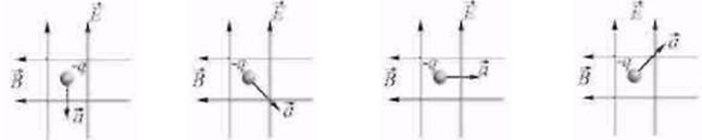 1) по окружности равномерно 2) по прямой линии, параллельной E и B, равномерно +3) по прямой линии, параллельной E и B, равноускоренно 4) по прямой линии, перпендикулярной E и B, равноускоренно ------------------------------------------------------------------------------------------------------------- 59. Положительно заряженная частица, летящая с постоянной скоростью по направлению к нам, влетает в одинаково направленные постоянные однородные электрическое и магнитное поля перпендикулярно им обоим. Правильное направление ускорения частицы в момент попадания в поля представлено на рисунке...