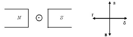 1) противоположно вектору магнитной индукции +2) перпендикулярно плоскости рисунка к нам 3) перпендикулярно плоскости рисунка от нас 4) против вектора магнитной индукции -------------------------------------------------------------------------------------------------------------