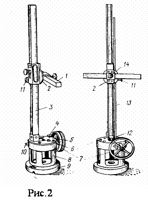 Устройство дефлектора Колонга показано на рис. 2. Компенсационный магнит 1 размером 95 х 10 х 10 мм изготовляется из высококачественного магнитного материала и имеет магнитный момент 1, 7 А • м2. Северный конец магнита отмечен риской. На время измерений магнит устанавливается в каретку 2, перемещающуюся по направляющей линейке со шкалой 3. Нижний конец линейки 3 прикреплен к основанию 5. В свою очередь, эта деталь крепится четырьмя винтами к стакану 8. Отверстия для винтов имеют эллиптическую форму, благодаря чему основание 5 вместе с линейкой 3 и измерительным магнитом 1 можно поворачивать на небольшие углы вокруг вертикальной оси. Такая операция выполняется во время выверки дефлектора для совмещения оси измерительного магнита 1 с визирной плоскостью пеленгатора. Поворот задается винтом 6. Стакан 8 дефлектора прикреплен к основанию 9, которое также может поворачиваться вокруг вертикальной оси, что необходимо для подгонки дефлектора к пеленгатору. Основание 9 имеет вертикальные вырезы для правильной ориентировки дефлектора относительно визирной плоскости при установке прибора на чашку пеленгатора. Прибор снабжен приспособлением для микрометрического перемещения измерительного магнита 1, состоящим из маховика 7, зубчатой планки 12 и штока 13. На оси маховика 7 имеется небольшая шестерня, сцепленная с зубчатой планкой. При вращении маховика планка поднимается или опускается вместе с ввинченным в нее штоком 13, который с помощью винта 11 может быть соединен с кареткой 2. При этом каретка с измерительным магнитом будет медленно перемещаться по линейке. Вспомогательный магнит 10 имеет длину 66 мм и диаметр 5 мм. Его магнитный момент равен 0, 2 А • м2. Этот магнит устанавливается в гнезде под основанием линейки и закрепляется винтом 4. Изменение величины Нк достигается за счет изменения расстояния r (рис.1)откомпенсационного магнита до картушки. Как известно,