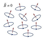 Рис. 3 В диамагнетиках молекулы не обладают собственным магнитным полем. Под действием внешнего магнитного поля в атомах и молекулах поле токов намагниченности направлено противоположно внешнему полю, поэтому модуль вектора магнитной индукции Подробнее механизм намагничивания диамагнетиков описан здесь: Слободянюк А.И. Физика 10. §13.3 Типы магнетиков. В парамагнетиках молекулы обладают собственным магнитным полем. В отсутствии внешнего магнитного поля из-за теплового движения вектора индукций магнитных полей атомов и молекул ориентированы хаотически, поэтому их средняя намагниченность равна нулю (рис. 4, а). При наложении внешнего магнитного поля на атомы и молекулы начинает действовать момент сил, стремящийся повернуть их так, чтобы их поля были ориентированы параллельно внешнему полю. Ориентация молекул парамагнетика приводит к тому, что вещество намагничивается (рис. 4, б).