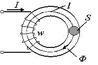 На рис.1 и 2 приведены неразветвлённые однородные (с неизменными значениями S и свойствами магнитопровода (μ) по всему замкнутому пути магнитного потока Ф) магнитные цепи с тороидальным (рис.1) и с прямоугольным магнитопроводами (рис.2). На рис.3 – неразветвлённая неоднородная магнитная цепь с различными свойствами магнитопровода на участках длиной l (из ферромагнитного материала с μ > > 1)и длиной δ (воздушный зазор с μ =1). В однородной магнитной цепи током I, протекающим по катушкам с числом витков w, возбуждается магнитное поле напряжённостью H = I w / l, А/м. (1) Полный ток, создающий магнитное поле, I w называется магнитодвижущей силой (МДС). В неоднородной магнитной цепи напряжённость магнитного поля будет разной на разных участках, и МДС будет распределяться между участками. Для магнитной цепи (рис.3) I w= Hст l + Hв δ. (2) Это выражение является частным случаем закона полного тока. Величины Hст l и Hв δ называют магнитным напряжением F1 и F2. В общем случае связь между электрическим током и напряженностью магнитного поля устанавливается законом полного тока и записывается в виде