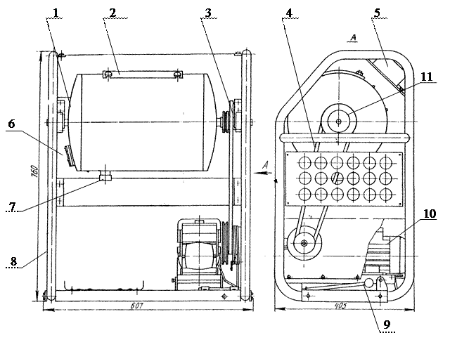 Рис 6. Загальний вид масловиготовлювача МИП –1500. 1 – ємність; 2 – кришка люка; 3 – підшипниковий вузол; 4 – ремінь; 5 – вимикач електричний; 6 – оглядового вікно; 7 – зливний штуцер; 8 – рама; 9 – ручка підйомника платформи; 10 – привод; 11 – шків. Масло виготовлювач ОМЕ-0, 13 (рис. 7) призначений для виробництва вершкової олії методом збивання на молокозаводах і маслозаводах малої потужності. Складається з циліндричної ємності з чотирма радіальними лопатами. Ємність, установлена на підшипниках кочення, на рамі звареної конструкції має вікно для завантаження сировини і вивантаження готового продукту, вікно для візуального контролю за технологічним процесом і кран для зливу сколотин. На стійці рами встановлений також привід, що складається з електричного двигуна і редуктора. Передача - клинопасова. Масловиготовлювач постачений зрошувальним пристроєм у вигляді двох перфорованих трубок, змонтованих над ємністю. Шафа приводу і електрошафа об'єднані в один блок.