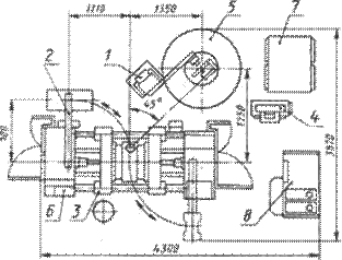 1.ПР (специальное исполнение); для заливки металла (1 шт.); 2.ПР (специальное исполнение) для съема и передачи отливок (1 шт.); 3.машина для литья в кокиль мод. 5925 (1 шт.); 4.установка термостатирования кокиля (1 шт.); 5.электропечь мод. САТ 0, 25 (1 шт.); 6.пульт управления ПР (1 шт.); 7.электрооборудование (1 шт.); 8.гидростанция (1 шт.). Рис..1. Комплекс для литья в кокиль мод. А5925 (с ПР)