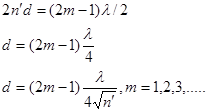 Решение: В случае нормального падения света на плоскую границу раздела двух сред коэффициент отражения где На границе просветляющий слой коэффициент отражения а на границе просветляющий слой-стекло Если волны, отражают от обеих границ, будут встречаться, имея разность фаз π, то они будут ослаблять друг друга. Максимальное ослабление (R=0) будет иметь место при равенстве амплитуд встречающихся волн. Если пренебречь вторичными отражениями от первой границы и учесть, что коэффициент отражения мал(порядка нескольких процентов), то можно считать, что амплитуды будут равны при равенстве коэффициентов отражения ρ 1=ρ 2 или Решая это уравнение находим