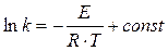 В координатах ln k – 1/T эта зависимость выражается прямой, тангенс угла наклона которой позволяет определить величину Е из экспериментальных данных. Интегрирование выражения 4 в пределах от Т1 до Т2 приводит к соотношению