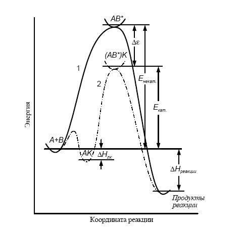 Рис. 1.Энергетические профили гомогенной реакции: сплошная кривая соответствует реакции без катализатора, пунктирная – каталитической реакции. Тепловой эффект каталитической реакции – такой же, как и в отсутствие катализатора