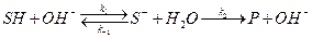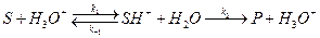 Это уравнение лежит в основе кинетики гомогенно-каталитических реакций. Из него видно, что скорость реакции прямо пропорциональна концентрации катализатора, что хорошо согласуется с опытными данными для многих реакций. Многие гомогенные реакции катализируются кислотами или основаниями. Реакции, катализируемые ионами H+ (H3O+) или OH–, относят к специфическому кислотному или основному катализу. Простейшие механизмы этих реакций включают обратимое взаимодействие субстрата (S) с каталитической частицей и превращение образующегося комплекса в продукт (P): специфический кислотный катализ: специфический основной катализ: Специфический кислотный катализ характерен для реакций дегидратации спиртов и кето-енольной таутомеризации, а специфический основной катализ – для альдольной конденсации. Гидролиз сложных эфиров ускоряется как в кислой, так и в щелочной среде. Скорость каталитической реакции пропорциональна концентрации протонированной формы субстрата: r=k2[SH+]. (17) В квазиравновесном приближении эту концентрацию можно выразить через константу основности субстрата: