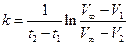 Отношение концентраций этилацетата C1 и C2, остающихся к моментам времени t1 и t2, может быть заменено равным ему отношением разностей объёмов барита, израсходованного на последнее титрование (V¥ ) и на титрование в момент t (Vt). В самом деле, V¥ пропорционально суммарному количеству кислоты – катализатора и всей образовавшейся уксусной кислоты, Vt – тому же количеству катализатора и уксусной кислоты, образовавшейся к моменту времени t, поэтому их разность пропорциональна ещё не образовавшейся уксусной кислоте к моменту времени t, а следовательно – количеству ещё не прореагировавшего уксусноэтилового эфира к моменту времени t. Заменив в уравнении концентрации на соответствующие разности объёмов, получим: