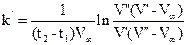 где x 1 и x 2 – концентрации CH3COONa или C2H5OH, образовавшихся соответственно к моменту времени t1 и t2. Для опыта берут две 100 мл колбы, в одну наливают пипеткой или из бюретки 50 мл В коническую колбу для титрования наливают мерным цилиндром 50 мл охлаждённой воды и 3 капли спиртового раствора фенолфталеина. Через 4 мин после смешения растворов эфира и щелочи пипеткой на 10 мл отбирают 10 мл смеси и в момент времени, отвечающий ровно 5 мин после начала реакции, вливают отобранный объём в колбу для титрования. Пробу немедленно титруют раствором соляной кислоты до обесцвечивания раствора. По окончании титрования колбу споласкивают водой и перед взятием следующей пробы также наливают 50 мл охлаждённой воды и 3 капли фенолфталеина. Через 14 мин берут следующую пробу и точно через 15 мин вливают её в колбу для титрования. Последующие титрования проводят через 25, 40 и 60 мин после начала реакции. Для вычисления константы скорости необходимо сделать еще одно титрование, отвечающее практически полному завершению реакции омыления. Чтобы ускорить окончание, последнюю пробу нужно нагреть. Для этого в чистую колбочку переносят 10 мл реакционной смеси, закрывают колбочку пробкой со вставленной в нее длинной стеклянной трубкой, служащей обратным холодильником, и помещают в баню с кипящей водой на 30-40 мин. Затем колбочку с пробой охлаждают под краном и в ней же титруют смесь. При вычислении константы скорости входящие в уравнение (30) разности концентраций (b-a), (a- х ¢), (a- х ²), (b- х ¢) и (b- х ²) заменяют пропорциональными им объемами 0, 01 н раствора соляной кислоты, израсходованными на титрование или определенными из результатов титрования. Разность (b-a) заменяется пропорциональным ей объемом соляной кислоты, затраченным на последнее титрование. Разности (b-х¢) и (b-х²), равные концентрациям непрореагировавшей щелочи к моменту времени t1 и t2, очевидно пропорциональны израсходованным на титрование объемам соляной кислоты V¢ и V² и, наконец, разности (a-х¢) и (a-х²), заменяются соответственно (V¢ -V¥ ) и (V² -V¥ ). После подстановки в (30) получим: