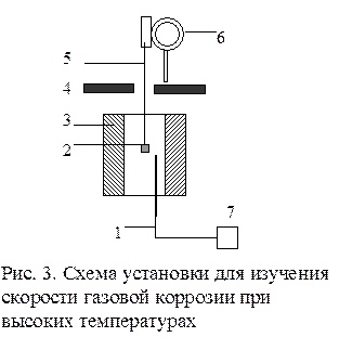 Испытуемый образец 2 подвешивают на нихромовом или кварцевом подвесе 5, состоящем из нескольких звеньев, в вертикальной трубчатой печи сопротивления 3, к коромыслу аналитических весов 6. Температуру в печи замеряют хромель-алюмелевой термопарой 1 и записывают на потенциометре КСП – 4 – 7. Конец термопары должен находиться вблизи испытуемого образца. Чтобы избежать нагрева весов, между печью и весами устанавливается экран 4. Работа по исследованию скорости окисления металла проводится следующим образом: включают обогрев печи и потенциометр КСП – 4. По достижению заданной температуры (регулируют при помощи ЛАТРа) подвешивают в печи испытуемый образец 2 и через 1 – 2 мин его взвешивают. За это время образец принимает температуру печи, но еще не успевает заметно окислиться. Далее в течение 1 – 2 ч через заданные преподавателем промежутки времени продолжают взвешивание образца. По окончании опыта при данной температуре образец вынимают, устанавливают в печи следующую заданную температуру, подвешивают в печи новый образец такого же металла и повторяют опыт в том же порядке. Результаты опытов по исследованию кинетики газовой коррозии сводят в таблицу по образцу. По табличным данным для каждой температуры строят графики в координатах G1 – τ, Δ G12 – τ и Δ G1 – ln τ, устанавливая таким образом, по какому закону идет окисление в определенной температурной области.