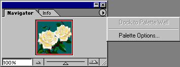 Багато операцій в програмі Photoshop, виконуються за допомогою палітр, які можна переміщати. У вікні кожної палітри, у її правому верхньому куті є кнопка зі стрілкою, що викликає команди меню для роботи з даною палітрою. Для того, щоб не займати великий простір на екрані, палітри за замовчуванням з'єднані в групи: Navigator/Info (Навигация/Информация), Color/Swatches/ Styles (Цвет/Образцы/Стили), History/Actions/Tool Presets (История/Действия/Набор инструментов), Layers/Channels/Paths (Слои/Каналы/Контуры) і Character/Paragraph (Шрифт/Абзац). Для того щоб відкрити яку-небудь палітру, скористайтеся командою Window (Окно). Зазначена палітра буде розташована поверх інших, що входять у ту ж групу. Для того щоб яка-небудь палітра “спливла” поверх інших, розташованих у тій же групі, клацніть по відповідній вкладці (імені палітри). Палітра Навігація (Navigator) За допомогою палітри Navigator (Навігатор) можна вибрати видимий у вікні фрагмент зображення або змінити масштаб такого фрагмента.