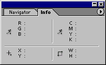 Палітра Інформація (Info) На палітрі Info (Інформація) відображаються колірні компоненти пікселя, на який у цей момент указує курсор. Також тут розташовуються дані про колірні зразки (максимум чотири), обрані на зображенні. Якщо відкрито діалогове вікно коректування кольорів, то на палітрі будуть відображатися відомості про колірні зразки до й після модифікації. Крім того, тут показуються координати Х і У курсору на зображенні. На палітрі може відображатися й інша інформація залежно від того, який інструмент активізований: наприклад, відстань між крапками при переміщенні виділеної області, при побудові фігури або при використанні інструмента Measure (“Измеритель”); розміри виділеної області або рамки, по якій буде обрізане зображення; або ширина (W), висота (Н), кут (А), вертикальний (V) і горизонтальний (Н) нахил при трансформації виділеної області. Щоб вибрати одиниці виміру для лінійок, клацніть по стрілці. Клацніть по стрілці й, не відпускаючи кнопки миші, виберіть режим для подання виведених даних: Actual Color (“Фактический цвет”), Proof Color(“Подтвердить цвет”), Grayscale (“черно-белый”), RGB, Web, HSB, CMYK, Lab Color, Total Ink(“общая краска”) або задайте значення параметра Opacity (“Непрозрачность”) поточного шару. Режим подання даних про кольори, установлений для палітри, може відрізнятися від режиму поточного зображення.