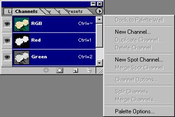 · Непрозорість - настроювання прозорості шару. Непрозорість - це протилежність прозорості. Тобто при 100% шар буде повністю непрозорий, а при 0% повністю прозорий. · Блокування - блокування шару від редагування (Прапорець кисті), блокування шару від переміщення (4 спрямована стрілка) і блокування всього (Замок) · Піктограма очей - позначення видимих шарів. (У прикладі (Рис. ліворуч) всі шари видимі). · Піктограма кисть - позначення активності шару, що редагується, тобто в цей момент ви можете редагувати тільки цей шар. Щоб активізувати потрібний шар вам необхідно нажати на ескіз шару · Піктограма f - настроювання ефектів шару · Піктограма ланцюг (на малюнку її немає) - зв'язування шарів, тобто ці шари й переміщаються й редагуються тільки разом. Щоб активізувати " ланцюг" Вам потрібно нажати на порожній квадратик відповідного шару (Цей квадратик між піктограмою очей і піктограмою шару) · Піктограма листочок (Ліворуч від кошика) - створення нового порожнього шару. · Піктограма кошик - видалення активного шару. · Область перегляду - загальні дані про шари (їхні загальні кольори, ефекти...) Звичайно, при створенні нового зображення його тло є непрозорим. Палітра Layers (Шари) дозволяє додавати, видаляти, показувати/приховувати, копіювати, групувати, зв'язувати й міняти порядок проходження шарів, розташованих поверх тла. Кожному шару може відповідати свій власний режим змішування й рівень прозорості, і кожний шар допускається редагувати, не змінюючи при цьому інші. Також із шаром можна зв'язати маску (mask). Крім стандартних шарів у програмі Photoshop можна створити й два інших види шарів: коригувальний шар (adjustment layer), що використовується для тимчасового застосування кольорів або коректування кольорів шарів, що розташовані під ним; і текстовий шар, що редагується (editable type layer) і автоматично створюється при використанні інструмента Турі (Текст) або Vertical Type (Вертикальний текст). Якщо до шару застосувати ефект (наприклад, Inner Glow (Внутрішнє світіння), Drop Shadow (Відкинути тінь)), поруч із ім'ям шару з'явиться піктограма ефекту й кнопка виклику спливаючого меню. Редагувати можна тільки поточний шар (який називається обраним або активним). Вибрати шар просто - досить клацнути по його імені на палітрі Layers. Для того щоб самим нижнім шаром нового зображення замість непрозорого тла став прозорий шар, установіть прапорець Transparent (Прозорий) у групі Contents (Зміст) у діалоговому вікні, що викликається командою File > New (Файл > Новий). Палітра Канали (Channels) У палітрі Channels (Канали) відображається один або більше каналів, які й створюють зображення. Також за допомогою цієї палітри можна створити альфа-канали, що використовуються для збереження виділених областей, і канали замовлених, або плашечних, кольорів (spot color channel), необхідні при кольороподілі.
