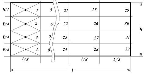 де f - періодичність відбору; q - вантажопідйомність грейфера, т; n - кількість точкових проб, які необхідно відібрати; М - кількість матеріалу, що випробується, т. Під час транспортування судном палива однієї марки або сорту від всього завантаженого матеріалу відбирають одну об'єднану пробу. Якщо матеріал різних марок і сортів, об'єднана проба відбирається від кожного окремо. Відбір проб безпосередньо з барж допускається тільки в тих випадках, якщо неможливо провести відбір з потоку або грейфером. Точкові проби рівномірно розподіляють за всією площею по схемі (мал. 8.5).