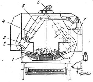 де Q - продуктивність потоку матеріалу, що випробується, т/год; b - ширина ковша, м; v - швидкість руху ковша, м/с. Пробовідбірник має просту конструкцію, малу висоту, зручний в експлуатації, дає достатньо високу точність випробування.