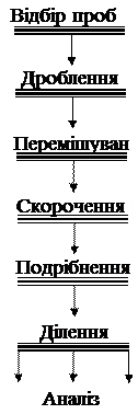 Відібрана проба при обробці піддається різним механічним перетворенням. Зазвичай це перемішування, дроблення, скорочення, ділення. Хоча всі ці операції змінюють стан проби, вони, за винятком операції скорочення (ділення) не міняють головної властивості початкової (первинної) проби - певної характеристики маси, що випробується, наприклад, зольність, вміст вологи з деякою похибкою. Це конкретне значення похибки при відборі проби не міняється. Воно може мінятися при неякісному виконанні цих операцій за рахунок втрат маси або засмічення її сторонніми добавками. Типові операції при підготовці проби представлена на рис.10.1.