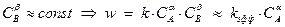 Показатели степени при концентрациях в кинетическом уравнении Коэффициент пропорциональности Любая химическая реакция представляет собой совокупность элементарных актов химического превращения. Каждый такой акт есть превращение одной или нескольких находящихся в контакте или взаимодействии частиц реагентов (молекул, ионов, свободных радикалов) в частицы продуктов. Простые реакции состоят из однотипных элементарных актов. В зависимости от числа частиц, принимающих участие в реакции, они делятся на мономолекулярные, бимолекулярные и тримолекулярные реакции (т.е. молекулярность реакции равна единице, двум и трем, соответственно). Реакции, при протекании которых осуществляются разнотипные элементарные акты, называются сложными реакциями. К ним относятся обратимые, параллельные, последовательные и др. многостадийные реакции, цепные реакции, сопряженные реакции и др. Уравнение может быть достаточно строго обосновано лишь для некоторых частных случаев. Например, на основе теории активных соударений – для простых реакций. Только в этом случае частные порядки Чаще всего Для реакций нулевого порядка скорость не зависит от концентрации реагирующего вещества. Обычно это бывает, если концентрация реагента не меняется в ходе реакции, например в гетерогенных реакциях, когда реакция происходит на поверхности. Аналогичная картина будет наблюдаться, когда данный компонент взят в большом избытке. В этом случае его концентрация приблизительно постоянна в ходе реакции. Примером может служить любая реакция, где одним из реагентов является растворитель, а концентрация других реагентов невелика. Часто при изучении кинетики реакций искусственно добиваются того, чтобы порядок по одному из компонентов получился равным нулю. Для этого кинетическую кривую получают при большом избытке (например, стократном) выбранного реагента. Например, если в реакции реагент B взят в большом избытке, то: