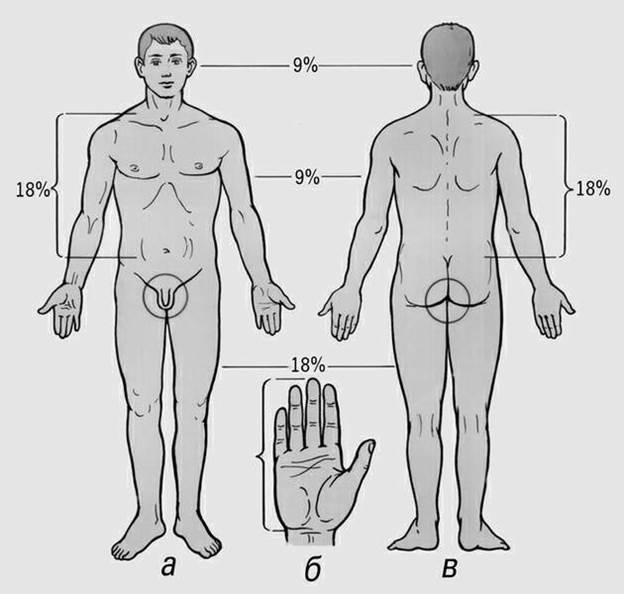 Важную роль в определении тяжести поражения играет не только глубина, но и площадь ожога. Существует несколько методов вычисления площади ожога. Правило девяток Поверхности разных частей тела составляют примерно по 9 % (или кратно этому числу) от общей площади поверхности тела: Голова и шея — 9 % Верхние конечности — по 9 % Нижние конечности — по 18 % Туловище спереди — 18 % Туловище сзади — 18 % Область промежности — 1 %