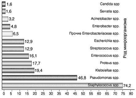 Рис. 3. Микроорганизмы, высеваемые из ожоговых ран (по данным лаборатории бактериологии, эпидемиологии и антибиотикотерапии НИИ СП им. Н.В. Склифосовского)