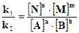 Применим закон действия масс и запишем выражения скорости прямой и обратной реакций: · скорость прямой реакции: vпр. = k1[A]a[B]b (11) · скорость обратной реакции: vобр. = k2[N]n[M]m (12) · в состоянии равновесия: vпр. = vобр. , т.е. k1[A]a[B] b= k2[N]n[M]m (13) Переносим постоянные величины (константы скорости) в левую часть равенства, а переменные (концентрации) – в правую часть равенства, т.е. записываем данное равенство в виде пропорции: