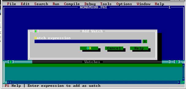 В поле ввода вводится одна или несколько переменных, значения которых надо отследить. Это окно убирается клавишей Esc. Остается окно Watches, в котором указаны имена переменных и, через двоеточие, их значения. Используя пошаговое исполнение программы можно видеть, как меняются значения этих переменных. Если нужно добавить еще одну переменную в окно Watch, то, не выходя из редактора, нужно нажать комбинацию клавиш Ctrl + F7. Опять появится окно Add Watch, в которое добавляется имя новой переменной. Если окно Watch активно, из его списка можно удалить имя переменной. Для этого выбирается переменная с помощью клавиш управления курсором и нажимается клавиша Delete. Окно Watch убирается и восстанавливается с помощью клавиши F6. Для изменения значений некоторых переменных выбирается режим Evaluate/Modify в пункте меню Debug (или нажатием клавиш Ctrl + F4). Открывается диалоговое окно: