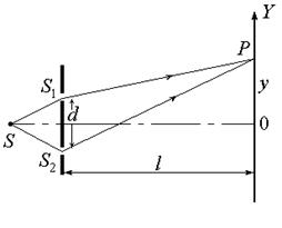 Опыт Юнга. (1801 г.) Рассмотрим интерференцию, возникающую в результате выделения с помощью двух щелей S 1и S 2 участков сферического волнового фронта волны от точечного источника S (рис.5.3) (метод деления волнового фронта). Найдем разность хода лучей в произвольной точке наблюдения P на экране: