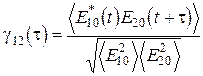 Эта функция определяет комплексную (в общем случае) степень когерентности исследуемых волн. Ее свойство: если произведение амплитуд волн за время t, много большее по сравнению с периодом колебаний, совершает хотя бы одно изменение знака, то она при t®¥ стремится к нулю, если нет – то к единице. Т.о. эта функция показывает степень сфазированности двух волн с одинаковой частотой за временной отрезок t. При различных частотах смысл функции корреляции несколько иной и мы его затрагивать здесь не будем. Пусть в интерферометре Майкельсона мы делим одну волну на две с временной задержкой t. Тогда функция