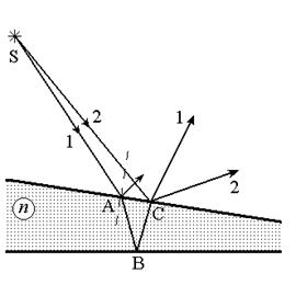 б) Полосы равной толщины. Теперь рассмотрим интерференцию света на пластинке с переменной толщиной (клине) (рис.5.8). В световом потоке, исходящем из источника S монохроматического света всегда присутствует волна 2, интерферирующая в точке C с волной 1, прошедшей по пути SABC. Если источник расположен достаточно далеко от поверхности клина и угол между поверхностями клина достаточно мал (эти условия на практике при изучении такой схемы интерференции, как правило, выполняются), то оптическая разность хода приблизительно определяется при прочих равных условиях толщиной клина в точке C и высчитывается по той же формуле, что и (5.30). Однако в этом случае интерференционная картина локализована на верхней поверхности клина. Интерференционную картину можно также наблюдать и с помощью линзы на экране. В этом случае поверхность проецируется на экран наблюдения. Линии одинаковой интенсивности совпадают с линиями постоянной толщины пластины, поэтому соответствующие интерференционные полосы называются полосами равной толщины. Ограничения на толщину клиновидной пластины, связанные со степенью временной когерентности (или монохроматичности) такие же, как и в случае плоскопараллельной пластины.