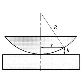 Кольца Ньютона. Примером интерференционной схемы, в которой наблюдаются полосы равной толщины, является воздушная прослойка, образованная между плоской поверхностью стекла и положенной на нее плосковыпуклой линзой (или наоборот) (рис.5.9). В этом случае линии равной толщины – окружности, поэтому интерференционная картина имеет вид концентрических колец. Потеря полволны происходит на нижней поверхности воздушного клина. Пусть h – толщина воздушного клина в точке минимума картины (темное кольцо), R – радиус кривизны линзы. Найдем радиус темного интерференционного кольца m -го порядка. Из геометрии рисунка видно, что