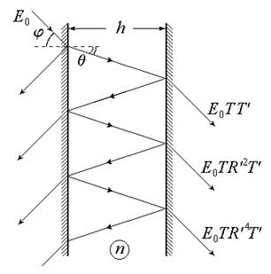 Многолучевая интерференция. До сих пор мы рассматривали интерференцию между двумя волнами. Теперь рассмотрим многолучевую интерференцию на примере интерферометра Фабри–Перо (ИФП) (рис.5.10). Исследуем сначала интерференцию многих световых волн при прохождении плоской монохроматической волны через плоскопараллельную диэлектрическую пластинку толщиной h и показателем преломления n. Обозначим