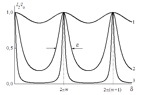 Интерференционные картины в проходящем и отраженном свете оказываются дополнительными. Вид функции Эйри (5.38) для трех различных коэффициентов отражения (1 – Â =0, 04; 2 – Â =0, 4; 3 – Â =0, 8) представлен на рис.5.11. Максимумы функции