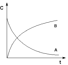 Графическое изображение зависимости концентрации реагентов от времени есть кинетическая кривая (рис.3.1). Рис. 3.2 Кинетические кривые для исходных веществ (А) и продуктов реакции (В). Истинную скорость реакции можно определить графически, проведя касательную к кинетической кривой (рис. 3.3); истинная скорость реакции в данный момент времени равна по абсолютной величине тангенсу угла наклона касательной: