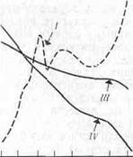 Рис. 7.3. Зависимость между интенсивностьюсвета и фотосинтезом у зеленых водорослей (У), диатомовых водорослей (//), белого дуба (Л/), ладанной сосны (/V) и кизила (V).