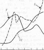 Рис. 7.2. Соотношение между продуктивностью фитопланктона (/) к концентрацией хлорофилла (II), фосфатов (х1, 7) (III), нитратов (IV), кислорода (V) и зоопланктона (VI, произвольные единицы) в озере Огак на Баффиновой Земле.