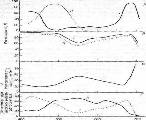 Длина волны, нм Рис. Поглощение света различной длины волны (спектр поглощения) в пределах видимой части спектра. А. Спектры поглощения двух светочувствительных пигментов—хлорофилла (Л и каротиноидов (Л). Б. Спектр поглощения целых листьев фасоли (/) и табака (//). В. Спектральное разложение света в тени леса из сахарного клена. Г. Относительная интенсивность фотосинтеза у мелководной аеленой водоросли Шуи (I) и у глубоководной красной водоросли РогрНуга (II) как функция области спектра. Красные водоросли фотосинтетически более активны в средней области спектра. Пигменты красных водорослей поглощают также синий и красный свет, но эти длины волн фотосинтетически относительно неактивны. Каротиноиды поглощают свет главным образом в синей и зеленой областях спектра (рис., А) и отражают свет с длинами волн, соответствующими желтой и оранжевой областям. Хлорофилл поглощает в красной и фиолетовой областях и отражает лучи зеленой области, которые мы и воспринимаем как цвет листьев. Спектр поглощения листьев в целом (рис. Б) примерно соответствует сумме спектров поглощения фотосинтетических пигментов, однако значительное количество света в оранжевой области поглощают, очевидно, органические соединения, не участвующие в фотосинтезе. Листья разных видов растений имеют разные спектры поглощения. Толстые, сильно пигментированные листья инжира поглощают 85% зеленого света (550 нм) — область спектра, в которой поглощение наименее интенсивно. Листья табака поглощают только 50% зеленого света. Вследствие такого избирательного поглощения света листьями свет, проникающий под полог леса, относительно богат в зеленой и инфракрасной, но беден в красно-оранжевой и голубой областях спектра (рис. В). Хотя вода кажется бесцветной, она поглощает небольшое количество света в красной области спектра и рассеивает голубой свет. Таким образом, вблизи нижней границы эвфотической зоны в океане преобладает зеленый свет. Фотосинтетические пигменты растений, живущих на суше и на мелководьях, слабо поглощают в зеленой области спектра, однако некоторые глубоководные морские водоросли содержат красные пигменты (эритрины), сильно поглощающие зеленый свет (рис., Г). Эритрины в прямых лучах солнца окрашены в красный цвет, а поэтому эти водоросли называют красными. Способность красных водорослей использовать зеленый свет позволяет им проникать на большую глубину, где не могут жить зеленые водоросли, содержащие такие же пигменты, как наземные растения.