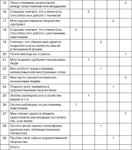 Начислите себе за положительные ответы, в том числе за ответы За, 4г, 56, по 5 баллов. 45 баллов и более – Вы активны, у Вас независимый характер и задатки руководителя. 40 баллов и менее – Вы робки, равнодушны, Вам лучше оставить мысли о карьере руководителя.