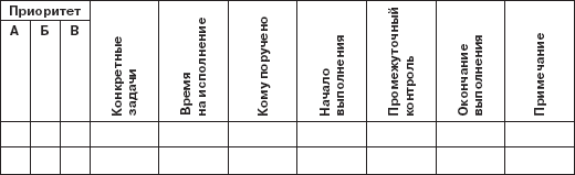 1. В целях выработки навыков в делегировании полномочий заполните по приведенному образцу так называемый реестр поручений, в который необходимо заносить конкретные задачи (в соответствии с приоритетностью АБВ), сроки исполнения и результаты контроля.