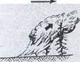 ставной частью. На этом основана современная тактика тушения верховых пожаров. Огонь низового пожара переходит на полог древостоя в насаждениях с низко опущенными кронами, в разновозрастных хвойных насаждениях, при обильном подросте, особенно при наличии на деревьях засмоленных карр. Чаще всего верховые пожары бывают в горных лесах при распространении огня вверх по крутым склонам. В значительной мере способствует возникновению верховых пожаров сильный ветер. Наиболее подвержены им заросли кедрового стланика и дуба кустарниковой формы (весной, когда держится сухой прошлогодний лист), а также хвойные молодняки на сухих местоположениях. В этих насаждениях пожар всегда бывает верховым. На участках, пройденных верховым пожаром, древостой хвойных пород, как правило, погибает полностью. Различают две формы верховых пожаров: верховой устойчивый и верховой беглый. При верховом устойчивом пожаре огонь по кронам распространяется по мере продвижения кромки устойчивого низового пожара, уничтожая подстилку, напочвенный' покров, валежник и сухостой, подрост н подлесок, ветви и даже крупные сучья; сильно обгорают стволы деревьев. Поэтому такой пожар называют также повальным — после него остаются лишь обугленные остатки стволов и наиболее крупных сучьев — «трубочисты». Верховые беглые пожары наблюдаются только при сильном ветре. При этом огонь обычно распространяется по пологу скачками, иногда значительно опережая фронт низового пожара. Такое распространение верхового огня объясняется тем, что тепло от горящих крон, поднимаясь наклонно по ветру, лишь частично попадает на соседние кроны и его оказывается недостаточно для их подогрева и подготовки к воспламенению. Подогрев полога происходит в основном за счет тепла от низового пожара. Под действием ветра это тепло подогревает кроны впереди на довольно значительном расстоянии. Затем происходит вспышка, и огонь быстро охватывает подогретые кроны. Когда фронт низового пожара пройдет участок, на котором кроны сгорели, начинается подогрев крон на следующем участке, и процесс повторяется (рис. 5). При продвижении горения по кронам ветер разносит искры, горящие ветви, хвою и т. п., которые создают новые очаги низовых пожаров за несколько десятков, а иногда и' сотен метров впереди основного очага, что в свою очередь создает условия для увеличения скорости распространения пожара.. Во время скачка пламя распространяется по кронам со скоростью 15—25 км/ч. Однако скорость распространения самого пожара меньше, поскольку после скачка происходит задержка, пока низовой огонь не' пройдет участок с уже сгоревшими кронами,