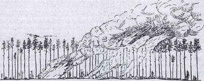 При устойчивом пожаре огонь, как принято говорить, «заглубляется». После сгорания покрова продолжает гореть подстилка, пни, валежник и т. п. Устойчивые низовые пожары развиваются обычно с середины лета, когда подстилка просохг нет. При таких пожарах преобладает беспламенный тип горения, сгорание горючих материалов происходит медленно и продолжается длительное время. На участке, пройденном устойчивым пожаром, насаждения получают серьезные повреждения: прогорает подстилка, сильно обгорают корни и кора деревьев, полностью сгорает подрост и подлесок. Здесь Могут создаваться благоприятные условия для развития верховых пожаров. Деление низовых пожаров на беглые и устойчивые имеет Обычно устойчивый низовой пожар — это вторая стадия по* жара беглого. Ведь низовой пожар начинается с загорания покрова или опада. Поэтому любой низовой пожар начинает распространяться как беглый. При наличии способных в данный момент к загоранию подстилки или валежника развивается устойчивый низовой пожар. Бывает, что пожар по мере развития 2 и даже 3 раза проходит по одной и той же площади. Сначала прогорает верхний слой горючих материалов. Затем, подсушившись и получнв доступ кислорода, начинает гореть нижележащий слой и т. д. Для низового пожара характерна вытянутая форма пожарища с неровной зигзагообразной кромкой. Цвет дыма при низовом пожаре — светло-серый. Верховой пожар является дальнейшей стадией развития низового пожара. Важная особенность верхового пожара состоит в том, что низовой огонь является его необходимой со-