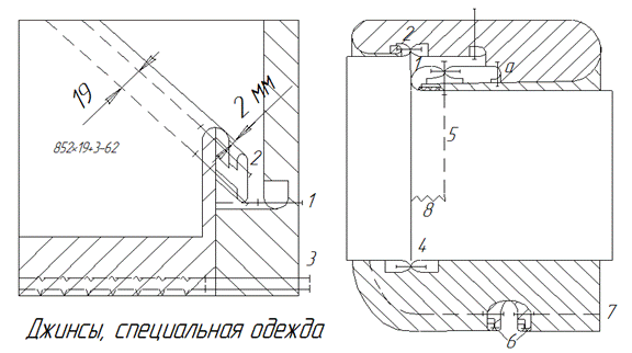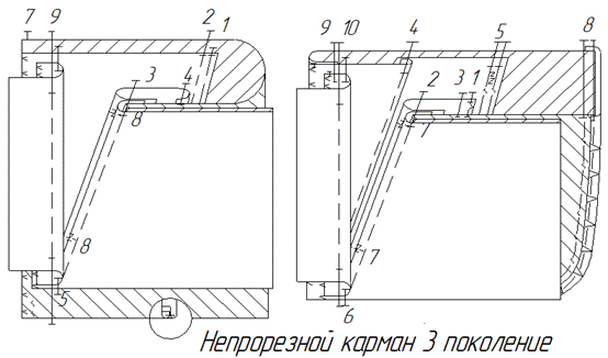 Вариант 5 – для потребителей с низким уровнем доходов 1 – настрочить подзор на подкладку кармана; 2 – настрочить обтачку на ППБ по линии входа в карман на 2-х игольной машине с образованием канта из ППБ; 3 – стачать срезы подкладки с одновременным обметыванием; Вариант 6 – срезы подкладки кармана могут стачиваться бельевым двойным швом в специальной и джинсовой одежде.