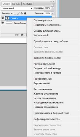 Данная функция активируется щелчком правой кнопкой мыши по текстовому полю палитры слоев Layers и выбором в выпадающем меню функции Rasterize Layer (Растрировать текст), здесь же можно производить и другие настройки текстового слоя прозрачности, специальные эффекты, режимы наложения. На панели свойств устанавливаются параметры текста: гарнитура, начертание, кегль, выравнивание, отбивка и т.д. Текст может располагаться как горизонтально, так и вертикально.