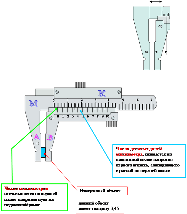 Штангенциркуль Штангенциркуль предназначен для измерения длины до 150-500 мм, с точностью до 0.1 или 0.05 мм. Штангенциркуль состоит из масштабной линейки – М с выступом А, называемым губкой, и подвижной рамки К, с другой губкой В. Рамка передвигается вдоль масштабной линейки, часть рамки снабжена нониусом. Измеряемый объект зажимается между губками масштабной линейки и рамки.