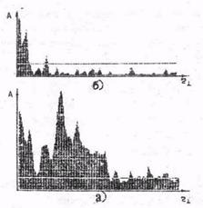 Рис. 1.10. Некогерентные азимутальные портреты электродинамической модели самолета: а - бортовой ракурс; б - носовой ракурс Они получены С.П. Лещенко с помощью миниатюрного трехсантиметрового лабораторного радиолокатора, обеспечивающего масштабное электродинамическое (разд. 4.2.2) моделирование. Макет устанавливается на вращающейся платформе. Для перехода к спектрам использовалась цифровая процедура БПФ Кули-Тьюки.